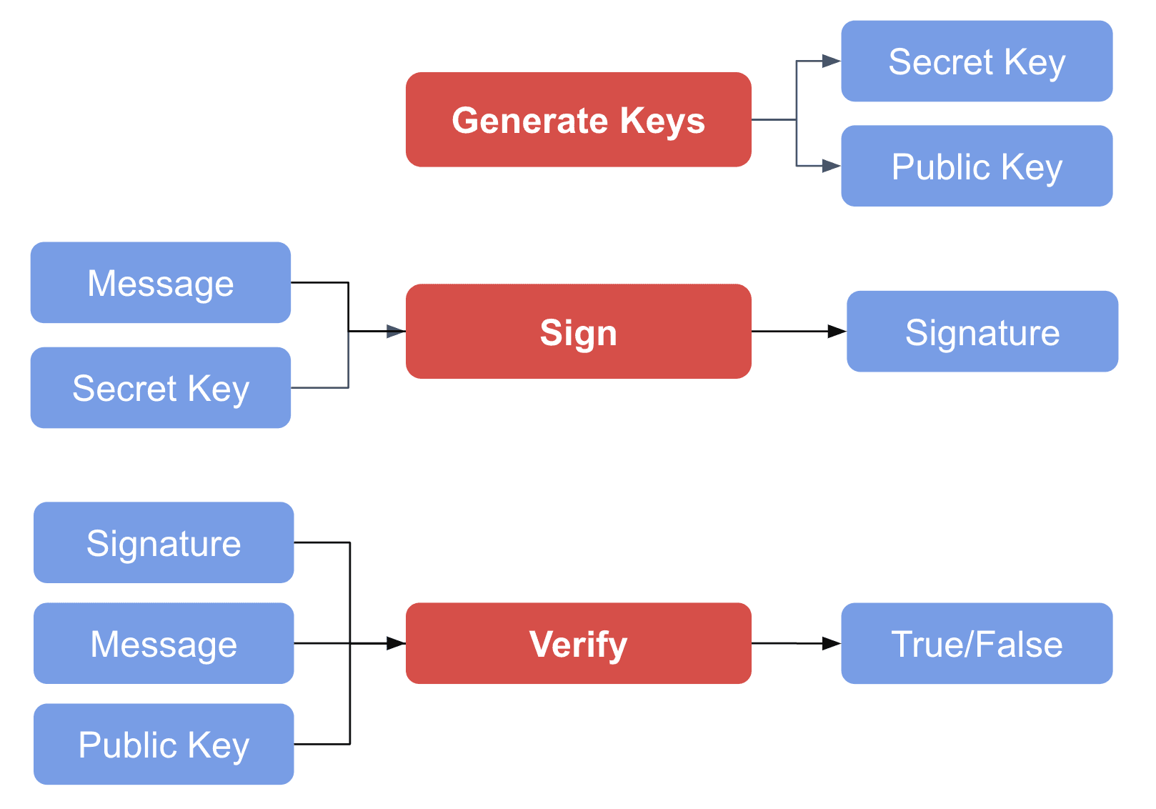 • Verify(Message, Signature, Public Key) => Valid/Invalid: This algorithm is used to verify the authenticity of a received message with the public key of the sender and its associated signature. The result is that the signature is either valid or invalid for the given private key.